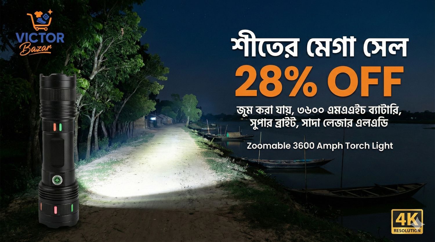 Featuring a heavy-duty aluminum alloy body, it is built to withstand rough use while maintaining a sleek, professional grip. The intelligent digital battery display (100%-75%-50%-25%) ensures you never run out of power unexpectedly. With its telescopic zoom function, you can instantly switch between a wide floodlight for covering large areas and a focused spotlight for long-distance visibility. Rechargeable and rain-resistant, this is the ultimate lighting tool for every Bangladeshi household.